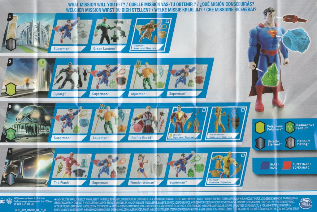 Spin Master tried to play up a collectible/blindpack element to the figures by using mystery accessory loadouts. In the first year, subtitled “Creature Chaos” for Batman and “Heroes Unite” for DC Universe, there are “missions” that determine the loadout. There is a punch-out card on the inside flap; the background of this card corresponds to the mission and the accessory loadout. Careful collectors seeking a specific loadout could peek at the card to see which mission they would get. All of the missions and the accessories they contained were detailed on an insert that came with each figure.