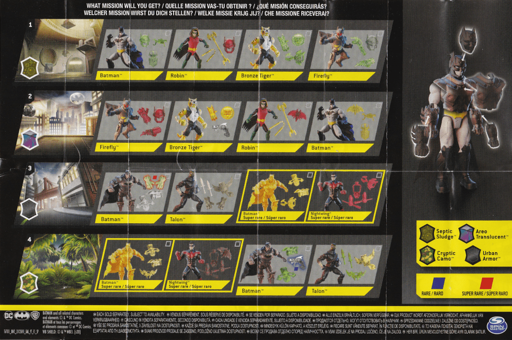 This wave’s Wal-Mart Exclusive Killer Croc appears to come with dark green or yellow-green accessories. I don’t know how they correspond to the different variations. There might be six different versions! In any case it appears there is just the one “companion” Batman.